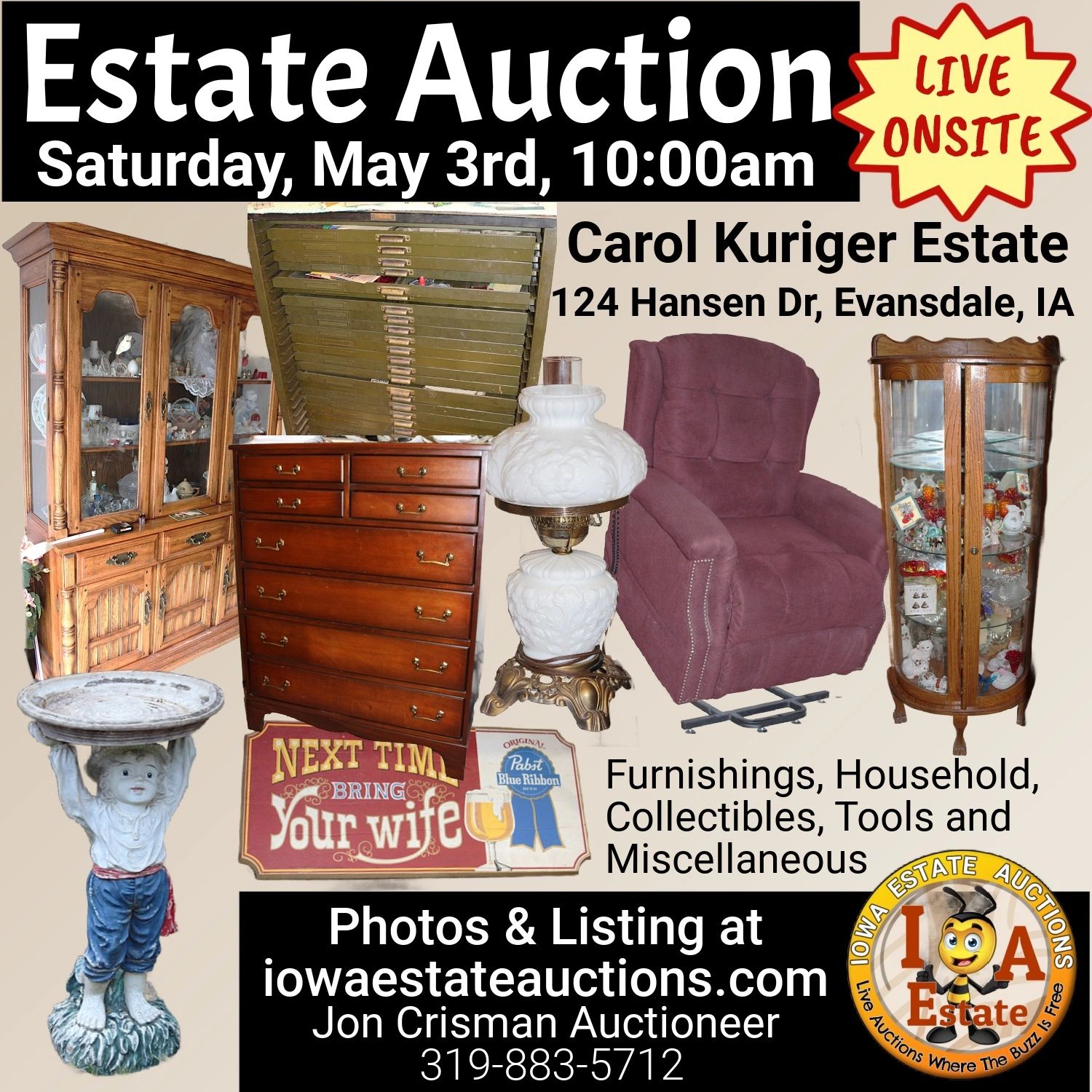 Featuring Items from the Charley Herzog Estate, Iowa City Iowa, An Illinois Estate, and a Northeast Iowa couple moving to a retirement center. Including a large collection of Fenton glass, plus Victorian porcelains, Coca-Cola, John Deere gold service awards, Fishing tackle, collectibles and unique items, plus more being added.